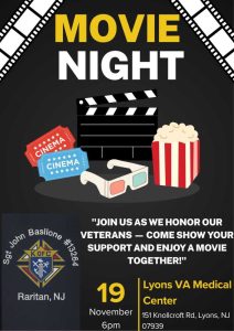 Meetings Veterans Movie Night AlejandroAndino November 19, 2025 No Comments Date/Time Date(s) - 11/19/20256:00 pm - 8:30 pm Location Lyons VA Medical Center Categories Meetings ← Annual Christmas Party Breakfast With Santa → Leave a Reply Cancel replyYou must be logged in to post a comment.